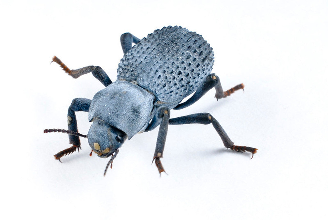 Blue death-feigning beetles (Asbolus verrucosus) are small insects found in arid regions of North America, such as deserts and scrublands. These beetles have a fascinating defense mechanism where they play dead when threatened, often flipping over and remaining motionless, resembling a lifeless creature. Additionally, they exhibit a distinct blue-gray coloration, helping them blend in with their arid surroundings. Their ability to feign death and their striking appearance make them a popular species among insect enthusiasts.